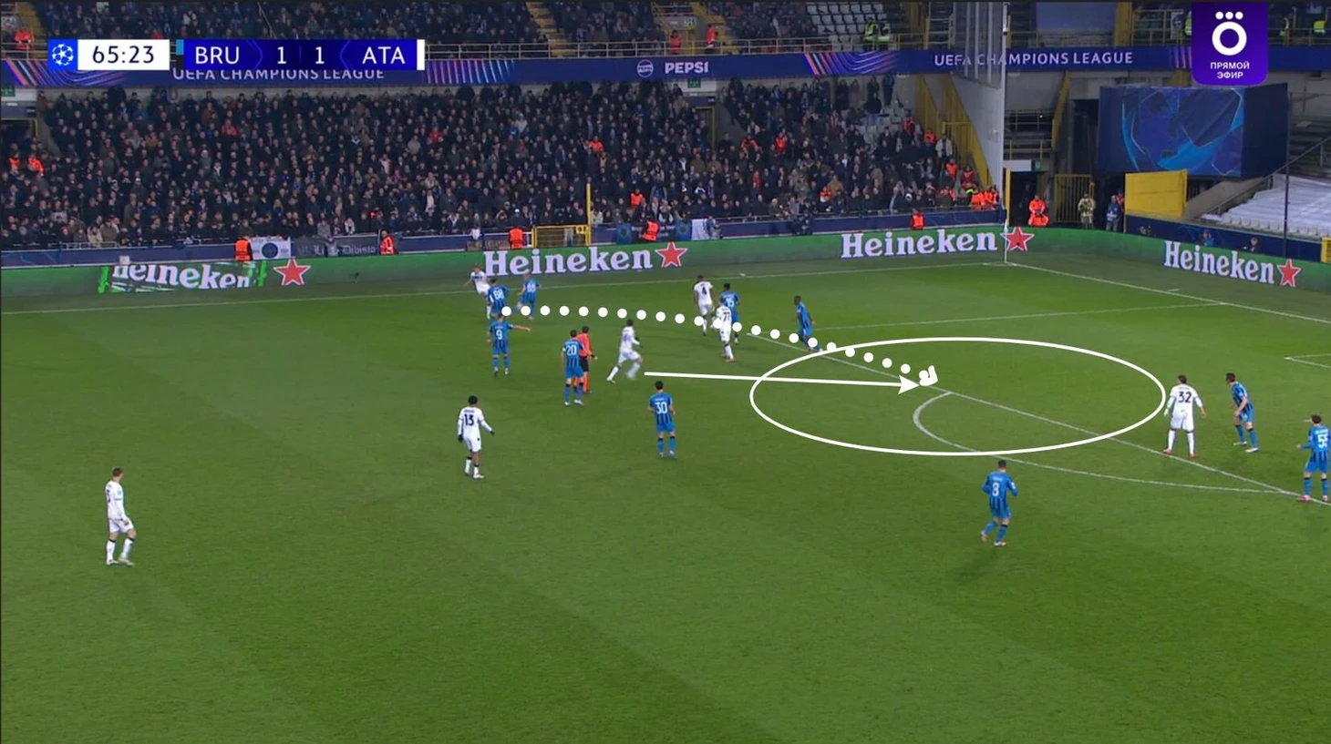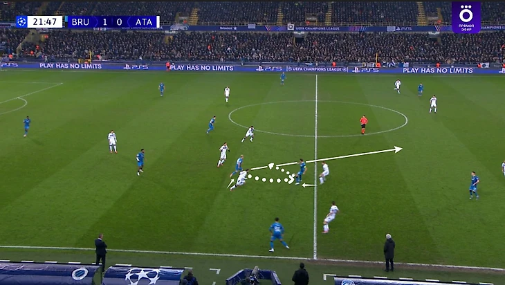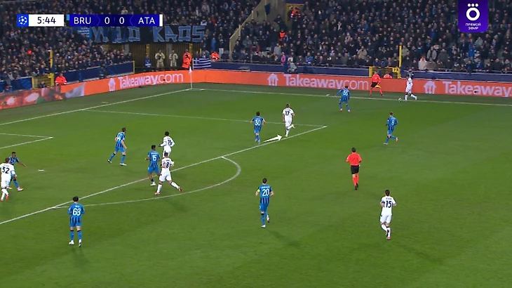 Другой нюанс – «Брюгге» через комбинации на третьего и стеночки преодолевал персоналку «Аталанты». Обычно один из защитников после передачи сразу открывался под ответный пас и тащил мяч в свободную зону. Так им удавалось закрепиться около штрафной.