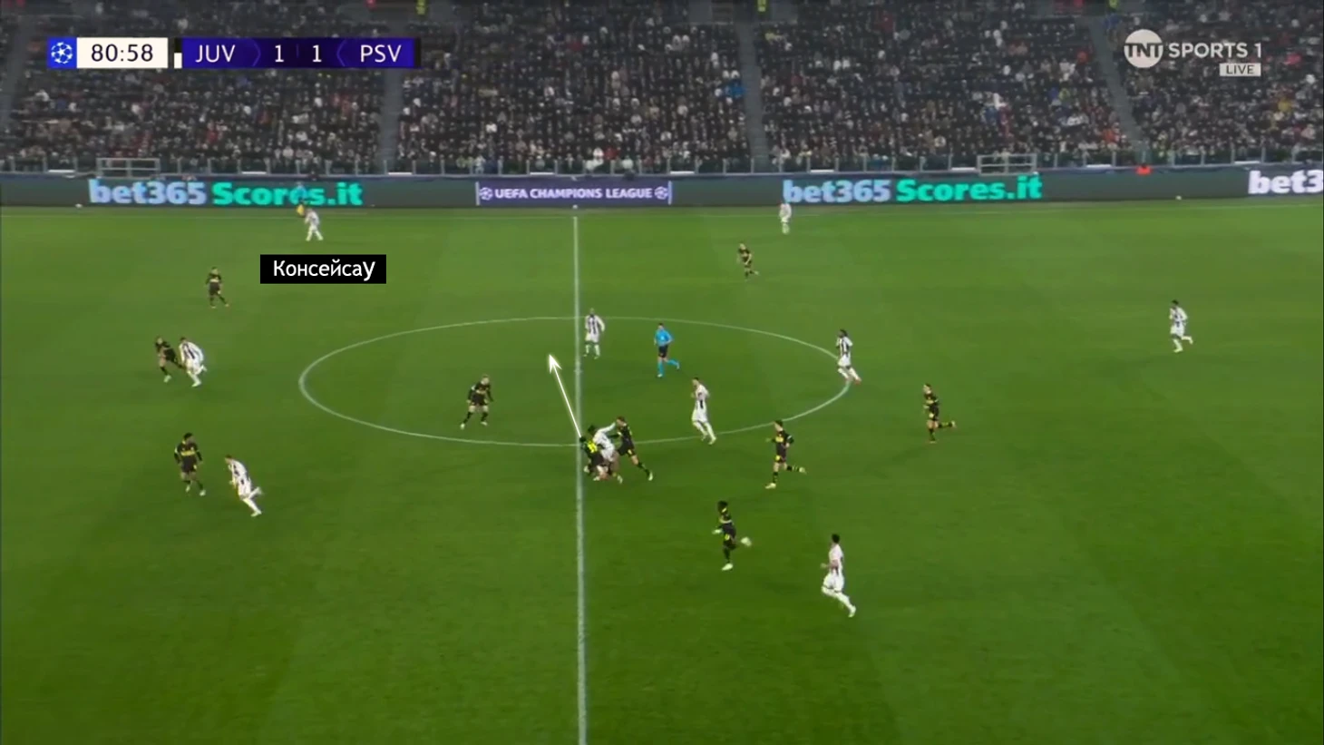 Из-за манеры прессинга ПСВ не успел прикрыть внешний коридор, когда Консейсау дошел до штрафной. Подстраховался только от смещения в центр, но для португальца даже такая ситуация с предсказуемым шагом – подарок: из-за исключительной взрывной скорости его сложно сдержать в одиночку.