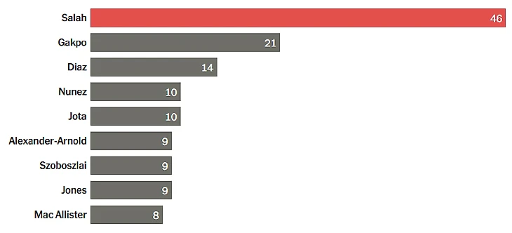 Коди Гакпо нельзя упрекнуть в низкой результативности, но степень важности Салаха для «Ливерпуля» подчеркивается, когда его голы и передачи сравниваются с результатами всех его товарищей по атаке: