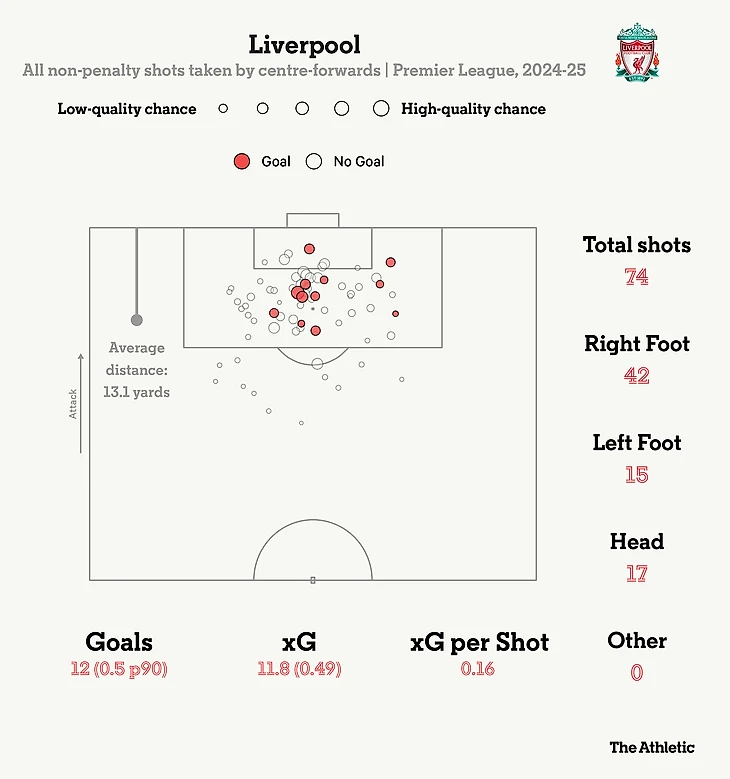 Всего 12 из 56 голов «Ливерпуля» в этом сезоне были забиты центральным нападающим. Ниже приведены данные по всем четырем игрокам, сыгравшим в этой команде, включая эпизод Федерико Кьезы против «Борнмута» в сентябре.