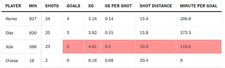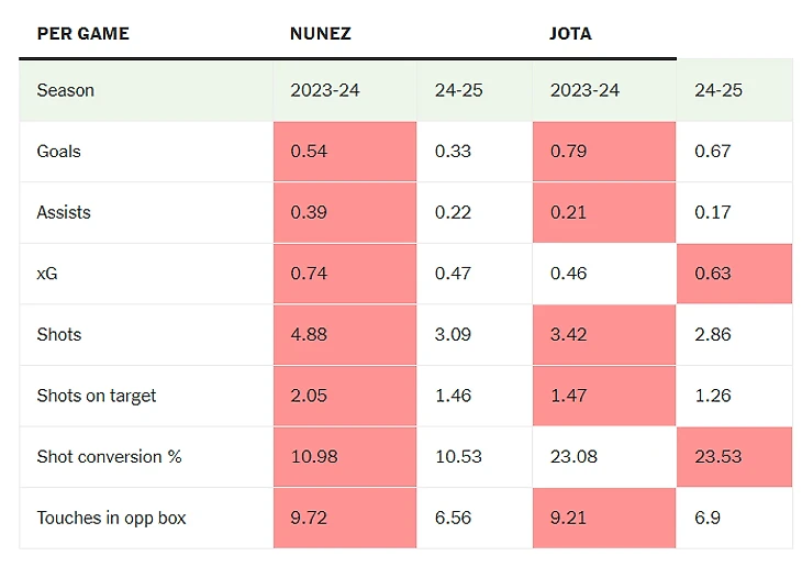 Сравнивая статистику нападающих с прошлым сезоном, можно заметить снижение общего количества ударов, ударов по воротам и касаний в штрафной соперника. Ожидаемые голы Нуньеса за 90 минут также снизились, в то время как показатели Жоты выросли, что говорит о том, что последний получает больше шансов, но с меньшей регулярностью.