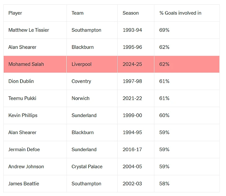Салах причастен к большему количеству голов своей команды, чем любой другой игрок