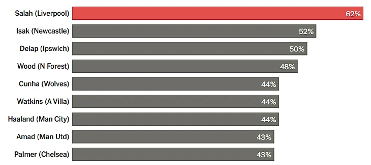 Когда игрок владеет мячом, его целью часто является передача мяча Салаху, чтобы тот завершил атаку, как показано на этом графике, сравнивающем вклад игроков Премьер-лиги в атакующие действия своих команд.