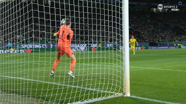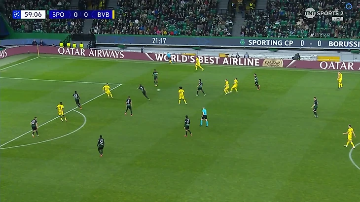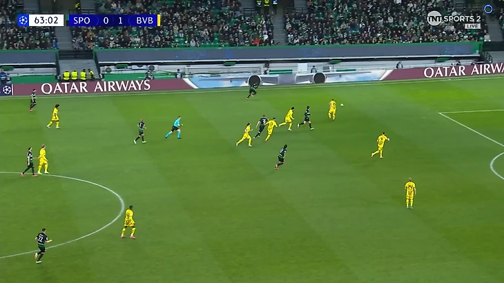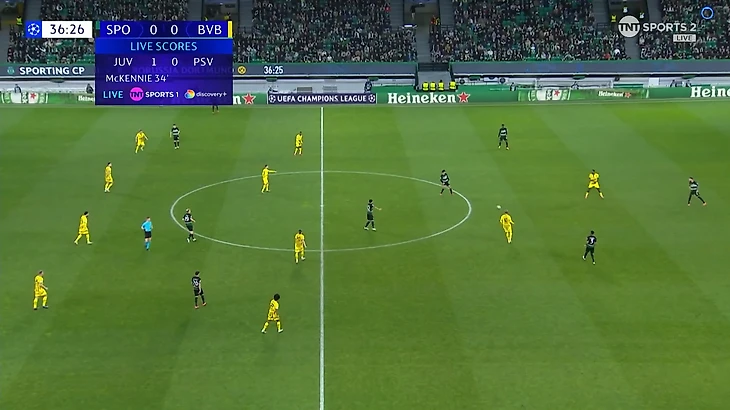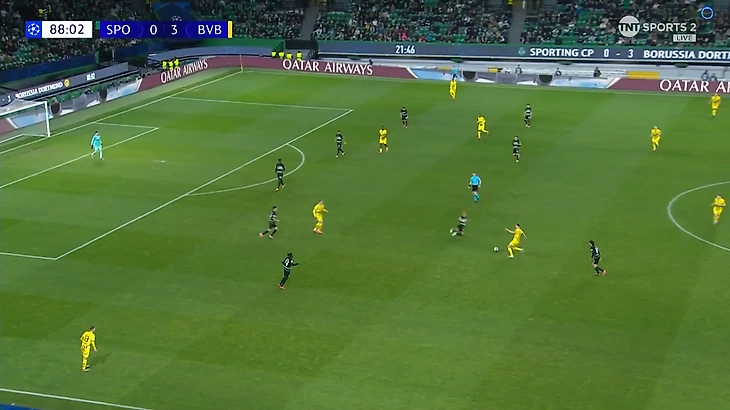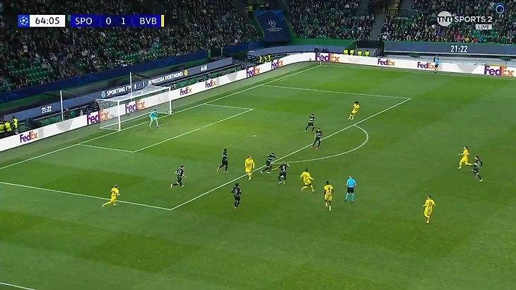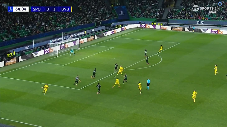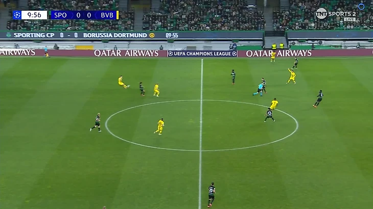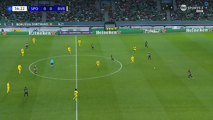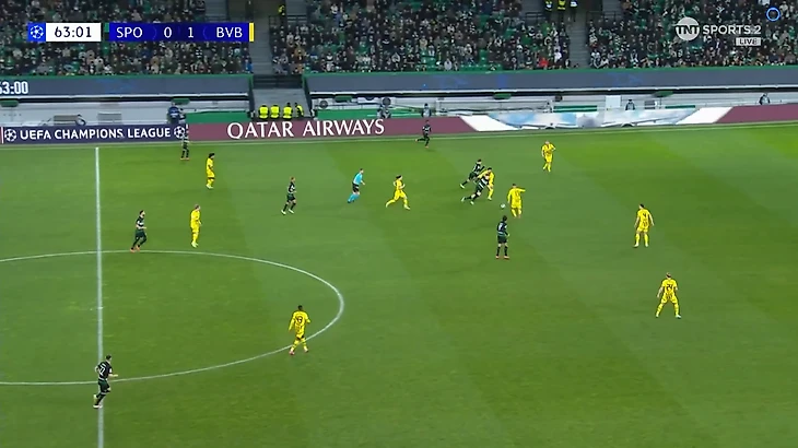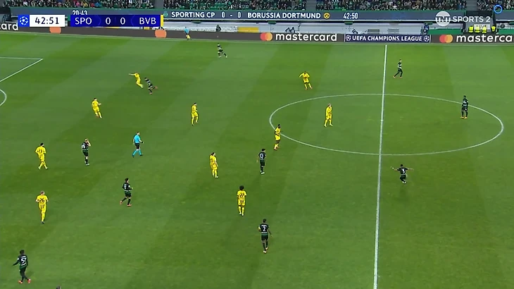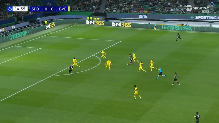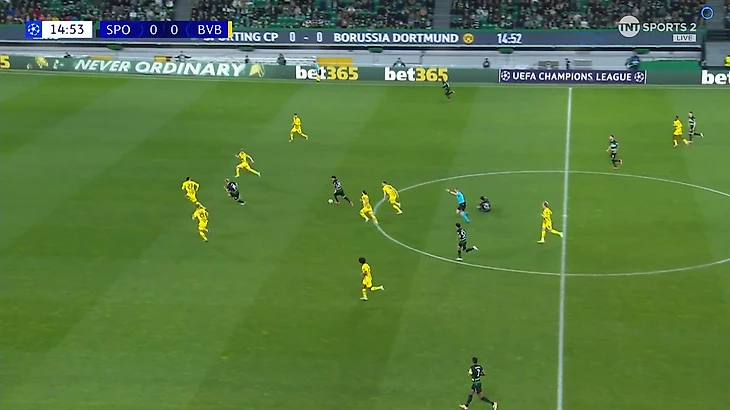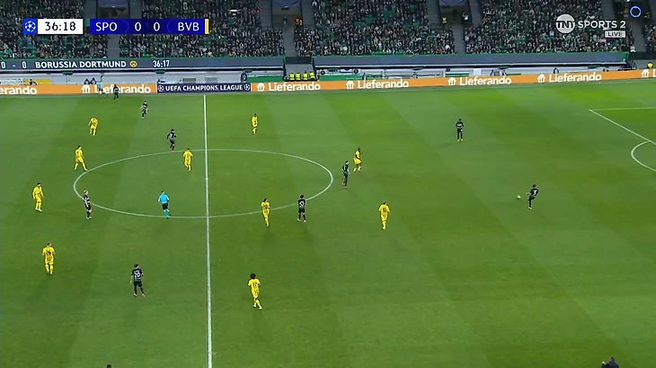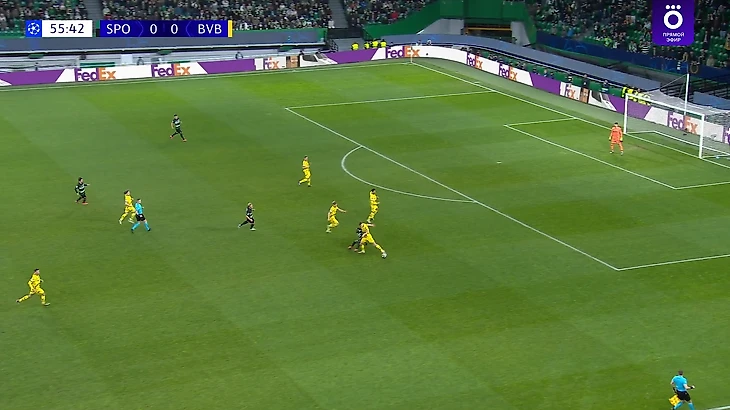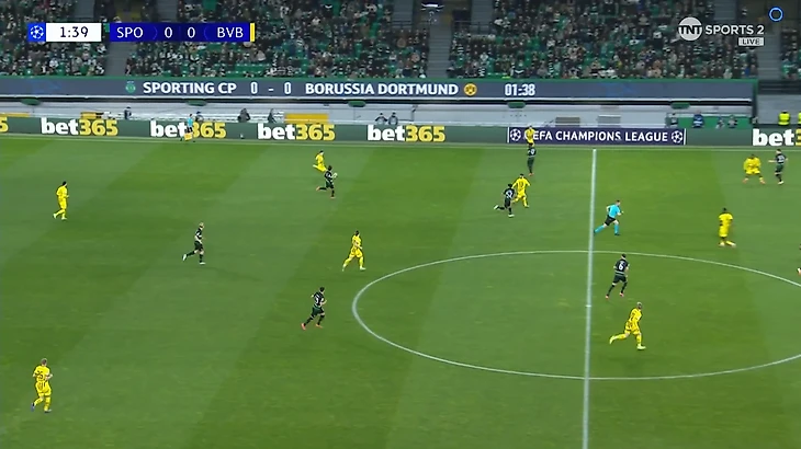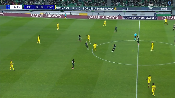 Игрок «Спортинга» у центрального круга в красных бутсах остался совсем без внимания, спокойно спустился вниз и открылся под передачу.