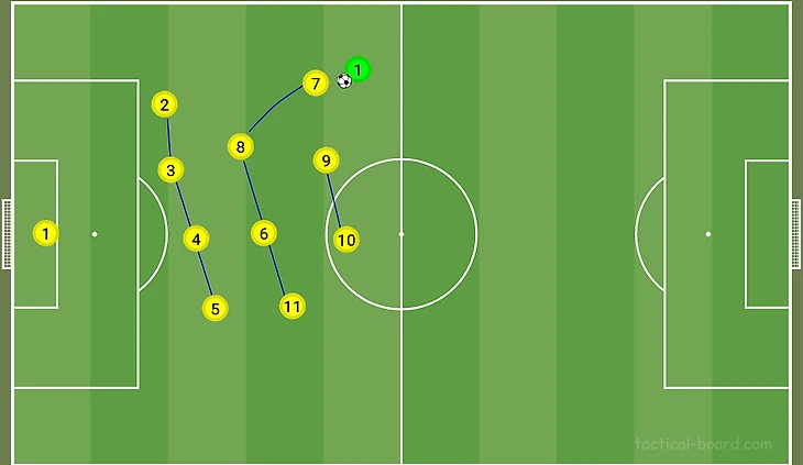 Ещё по матчу со «Штутгартом» было видно, что при владении мячом соперника Дортмунд выстраивается в 4-4-2. Игроки располагаются компактно, играя по мячу. Ещё одна маленькая деталь - игроки не находятся на одной линии, а создают некую диагональ.