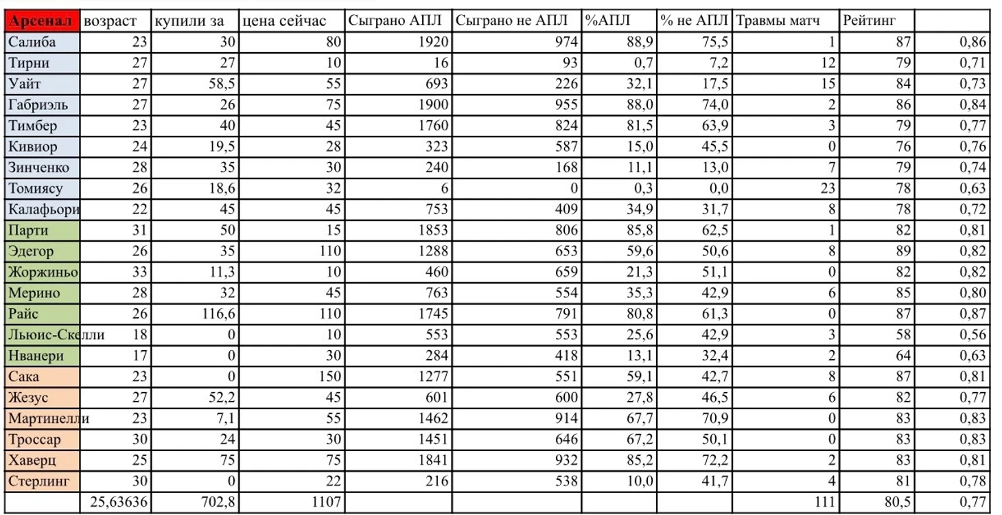 В частности, хочу рассмотреть то, как по ходу сезона идет «Арсенал», ведь «Манчестер Сити» объективно находится в кризисе, связанном с травмами игроков и перестройкой команды, «Челси» по всем прогнозам перед началом сезона, с новым тренером должен был максимум рассчитывать на Еврокубки, и не смотря на это, они достаточно долго шли вторыми и только недавно решили не прыгать выше головы, «Форест» выдает сезон жизни и воспринимать их как претендентов даже на ЛЧ по итогам сезона тяжеловато. «Арсенал» же совсем другое дело. Перед началом сезона было стойкое ощущение, что команда уже созрела, нужна буквально парочка точечных усилений и чемпионству никто помешать не сможет. В конце концов они два года подряд занимали второе место, упуская лидерство в последних турах, и это наталкивало на мысль, что злые и мотивированные канониры сейчас выйдут и сметут всех без каких-либо проблем. Но то были расклады и мысли фанатов перед началом сезона, реальность же сразу решила подостудить ожидания людей. Всего 2 трансфера на вход и оба не на самые проблемные позиции, да еще и игроки с завидным постоянством начали травмироваться. Собственно на этом я сегодня и хотел бы сконцентрироваться. Безусловно можно сколько угодно жаловаться на неудобный график, на судейский произвол, на странный мяч в кубке лиги, на отсутствие качественного усиления, но если ты обладаешь такими игроками как у «Арсенала» и декларируешь почти гарантированное чемпионство в этом году, все жалобы должны нивелироваться качеством состава и уровнем игры. И казалось бы, все команды сейчас страдают из-за травм, у всех плюс-минус одинаковое количество матчей и нет смысла жаловаться на это, но решив чуть-чуть погрузиться в эту тему я наткнулся на страшную аномалию, если верить которой, ни один клуб претендующий на что-либо серьезное в АПЛ за последние годы не испытывал такого кадрового дефицита как «Арсенал» на этой стадии сезона. Если честно, у меня самого складывалось ощущение, что «Канониры» не добирают очки там, где на бумаге должны разрывать соперников, но после чуть более глубокого анализа ситуации, я понял, что то место, которое они занимают в лиге и то количество очков, которое они набрали на сегодняшний день - подарок судьбы, ну либо гениальность тренера или отдельно взятых игроков. Но все по порядку.
