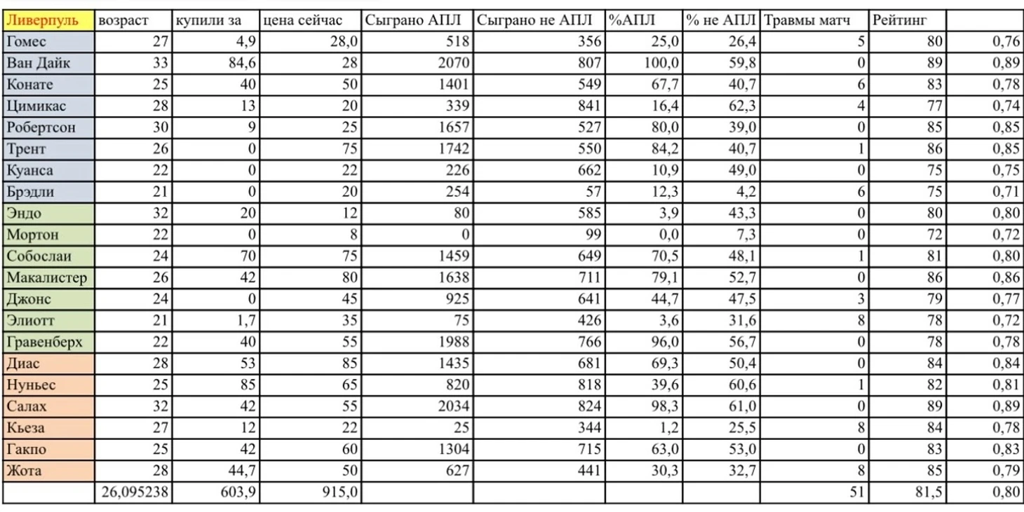 Цена на Transfermarkte тоже, к сожалению, не дает представления относительно реального уровня футболистов, так как учитывает не только их форму в нынешний момент, а еще кучу других факторов, основным из которых является возраст футболиста. То есть даже если игрок на протяжении нескольких лет показывает гениальную игру (привет Салах), но он уже старше 30, тогда его цена будет ниже, чем у любого тинейджера из топ лиги с одним качественным сезоном за плечами (привет любой тинейджер из топ лиги с одним качественным сезоном за плечами). Но в любом случае приведу цифры по стоимости игроков на сегодняшний день: «Арсенал» - 1107 миллионов, «Ливерпуль» - 915 миллионов. Если что, это цифра без учета голкиперов, так как на сегодняшний момент у обоих клубов нет проблем с ними и я решил не портить ими статистику.