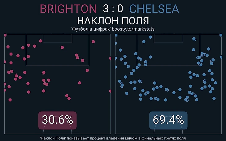 Суть игры нам передаст метрика «наклон поля». С ее помощью можно отследить процент владения мячом в финальной трети поля. Цифры – сильные, только обратите внимание на количество касаний внутри штрафной – у «Челси» они находятся все время «где-то рядом», а большинство остальных располагается как раз в полуфлангах, где гости пытались находить опасные моменты.