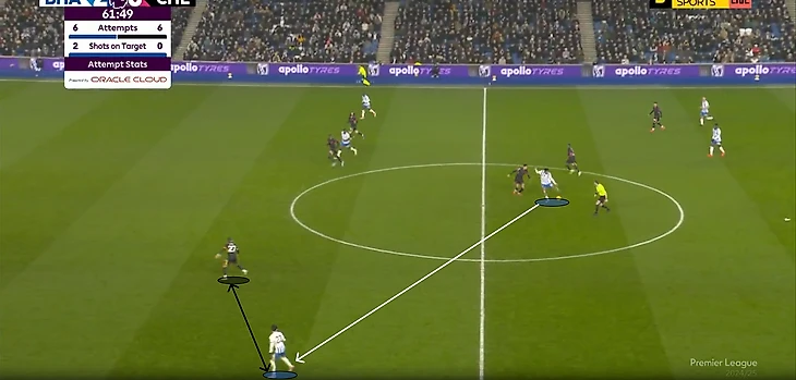 Форвард отыграл в стеночку с Уэлбеком и отправил мяч во фланг к Митоме, который оказался на хорошем расстоянии от Гюсто для приема и продвижения мяча. Проход японца ничего не дал, но благодаря неточному пасу Колвилла, у «Брайтона» появился второй шанс.