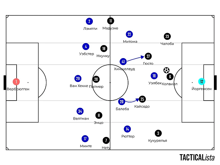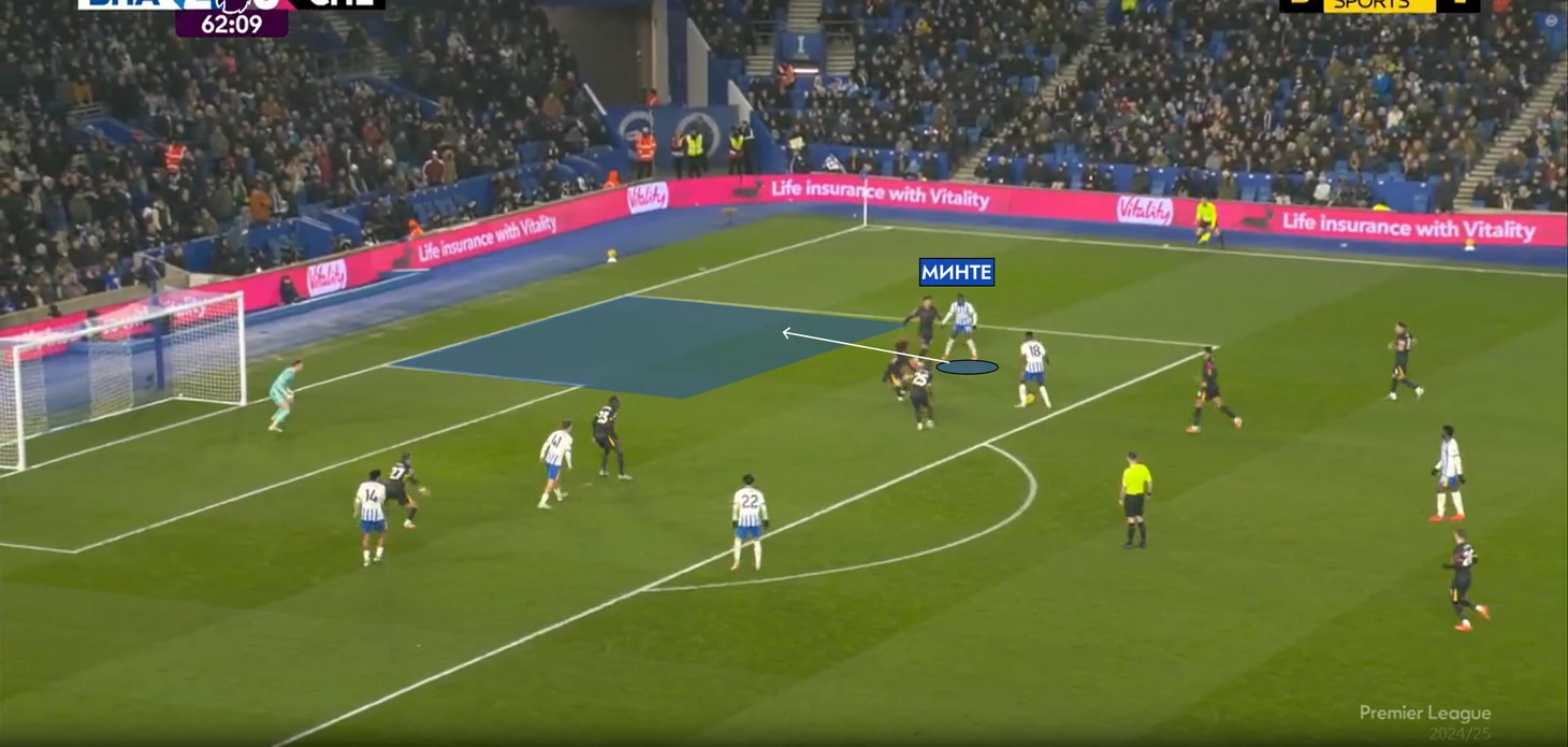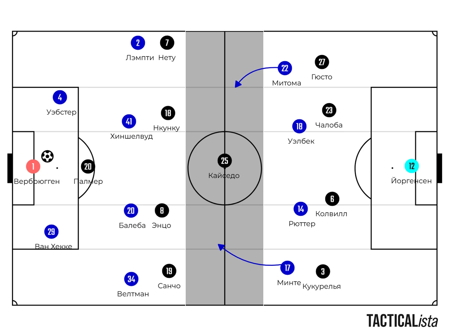 Но даже во время начала атаки, Митома и Минте находились 1 в 1 со своими фуллбеками, что также создавало сильную угрозу для «Челси».