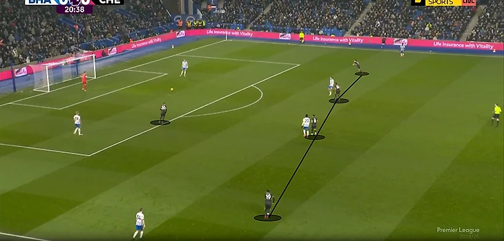 Все давно научились играть в позиционной обороне против «Челси» - компактный блок из 5 защитников, минимизация пространства между своими игроками. Часто мы можем наблюдать низкий блок из пяти защитников, но «Брайтон» довольно успешно играл в низком/среднем блоке «5-4-1».