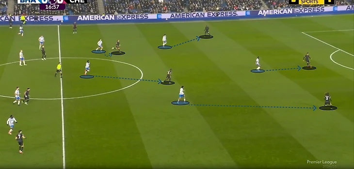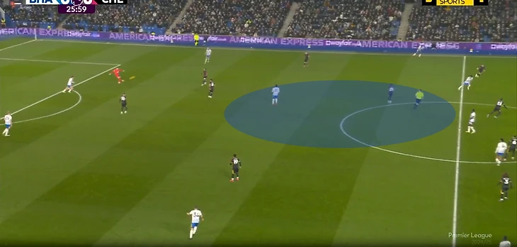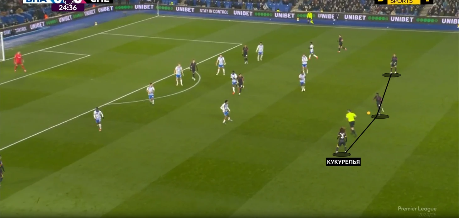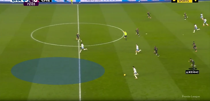 Но как же «Челси» строил атаки? В полуфлангах старался играть на второго с усилиями Нкунку и Энцо, но их подключения не увенчались успехом, так как «Брайтон» отлично держал линию обороны, бездумно не выдергиваясь на игроков.