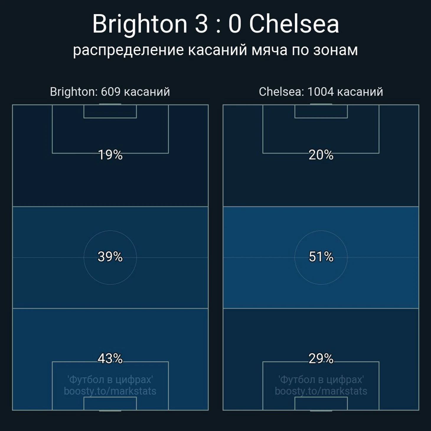 Следующий показатель, который поможет раскрыть суть атак «Челси» — это график распределения касаний мяча по зонам. «Синие» сделали 1004 касания, из которых 51% - в центре поля. Надо ли что-то добавлять?