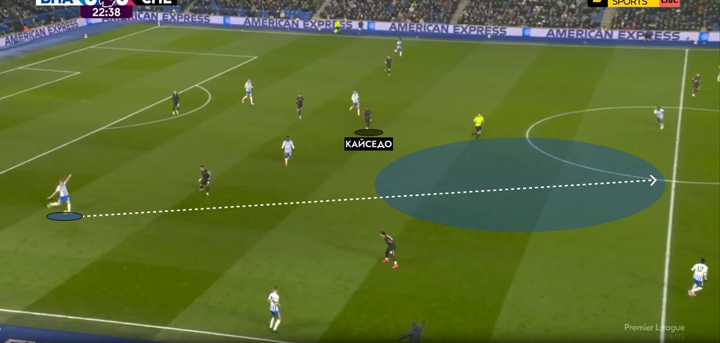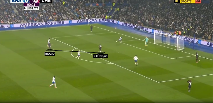 Проблема начинается, если заглянуть дальше средней линии – это опорная зона. В ней оставался один Кайседо, изредка получая поддержку от защитников. «Брайтон» мог спокойно получить преимущество в центре – достаточно было подключения вингеров вглубь, чтобы создавались ситуации «2 против 1».