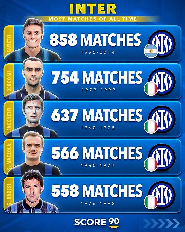 Хавьер Дзанетти немного отстал от миланского соседа: он провел 858 матчей в составе «Интера», забил 21 гол и отдал 37 ассистов.