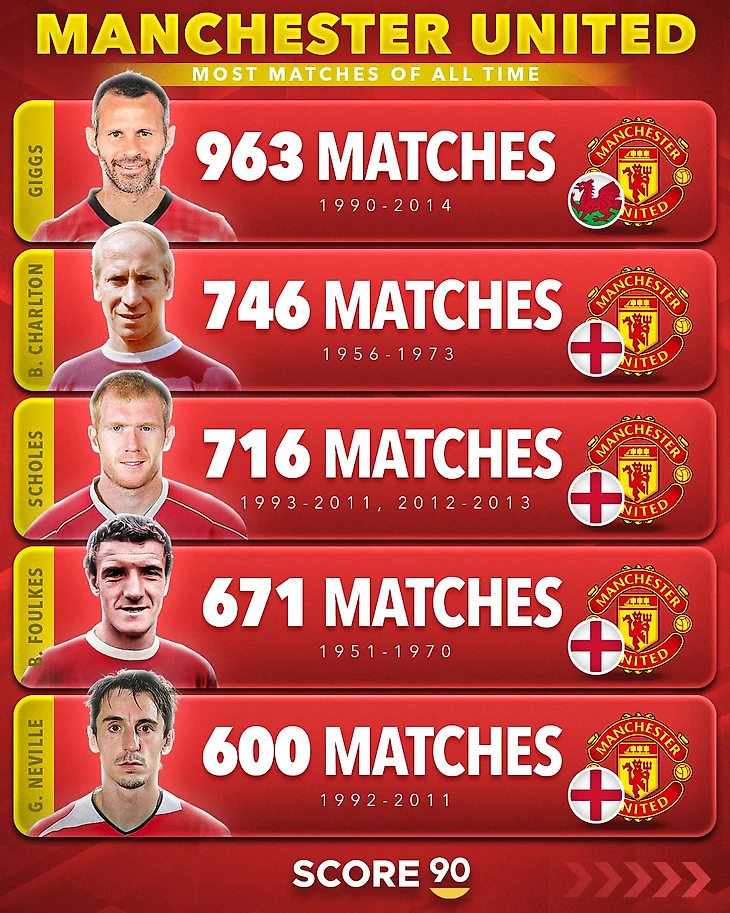 963 матча Райана Гиггза за «Ман Юнайтед» – рекорд всего рейтинга, на его счету 168 голов и 266 ассистов.