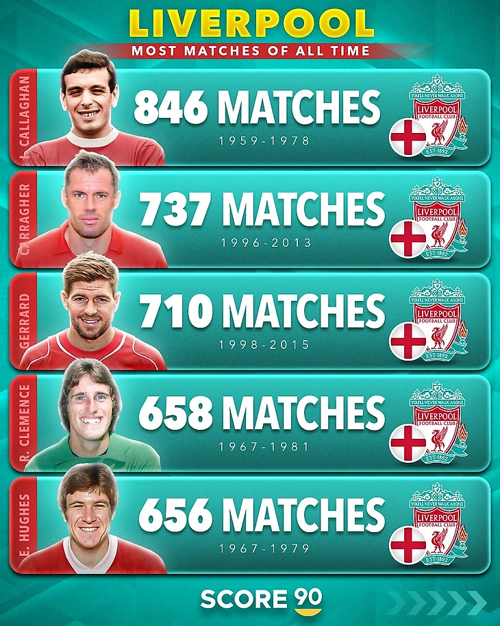 Рекорд по матчам за мерсисайдцев принадлежит Иану Каллагэну. За 19 лет в «Ливерпуле» полузащитник провел 846 матчей, забил 67 голов и отдал 79 результативных передач. В апреле Иану исполнится 83 года.