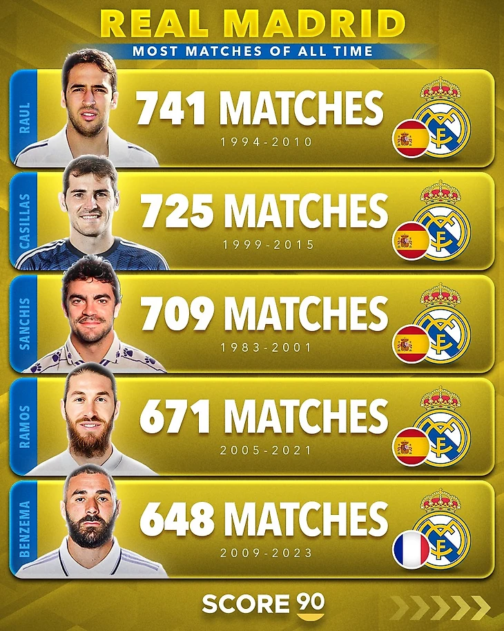 🔥 Рекордсмены по матчам за клуб среди грандов. Лишь один игрок до сих пор не сменил команду