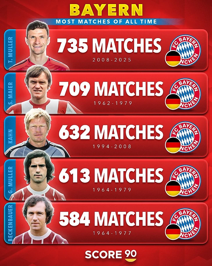 Томас Мюллер – единственный из всего рейтинга, кто до сих пор выступает за свой клуб. Раумдойтеру принадлежит рекорд не только по матчам за «Баварию» (735), но и по голевым передачам: он отдал 272 ассиста. Также на счету Томаса 247 голов за мюнхенцев.