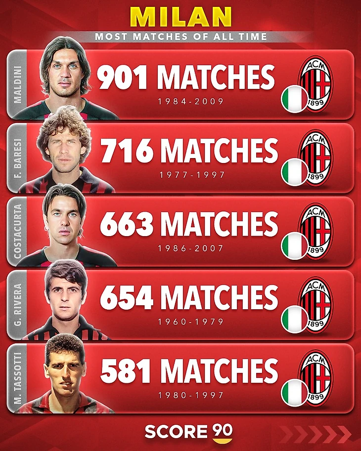 Паоло Мальдини преумножил наследие отца в «Милане»: 901 матч, 33 забитых мяча, 43 голевые передачи.