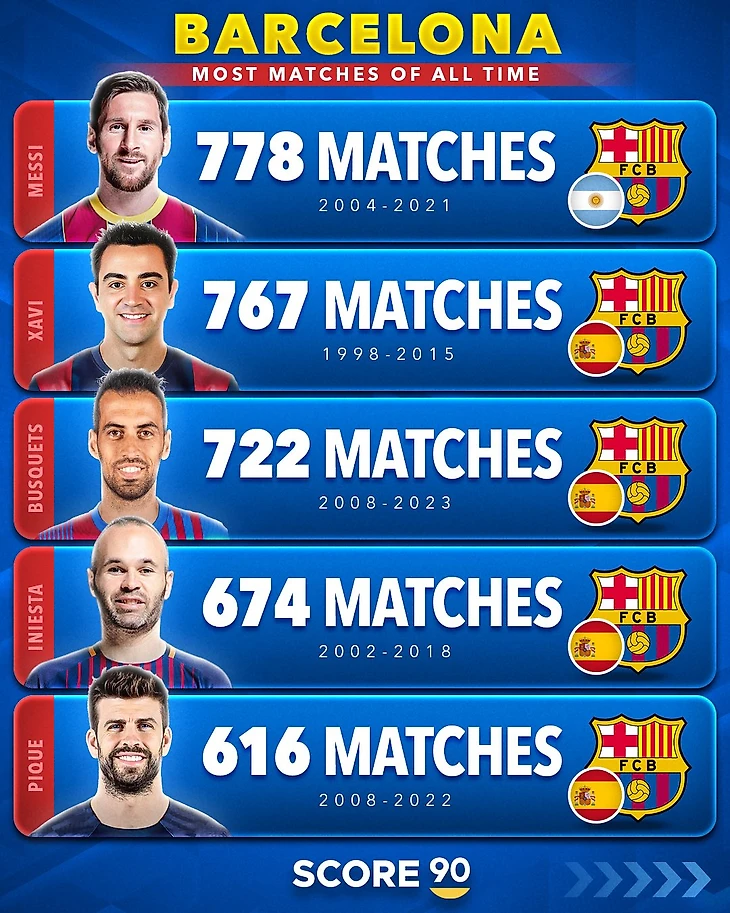 Лео Месси покинул «Барсу» рекордсменом по количеству матчей за клуб, обойдя Хави на 11 игр. Добавим к этому 672 мяча и 303 голевые.
