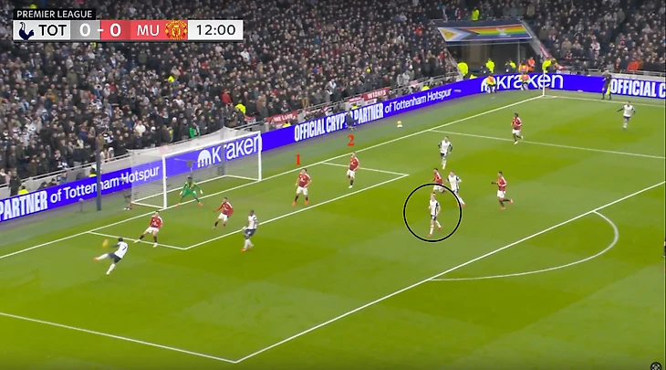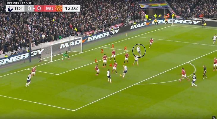 На скрине видно, что при подаче Далот играет по Телю, оставив в одиночестве Сона. Но при длинной подаче на дальнего игрока защитники бы успели перераспределиться и разобрать нападающих. Мазрауи, Магуайр и Де Лигт контролируют игроков, вбегающих в штрафную. Даже без опаздывающего к эпизоду Каземиро в штрафной равенство и для «Юнайтед» ничего не предвещает беды.