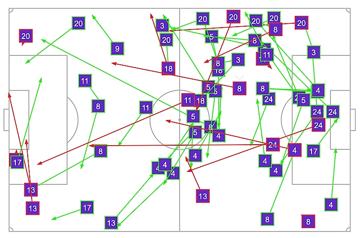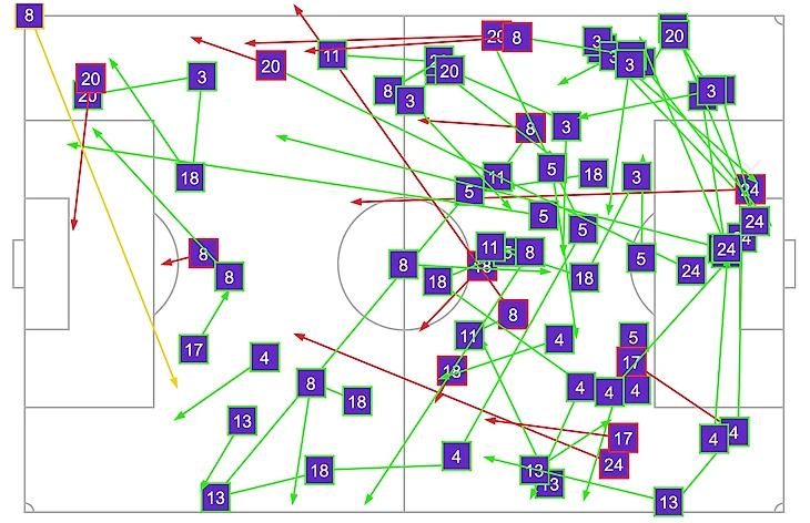 На рисунке выше вы можете увидеть все передачи с игры от игроков «Манчестер Юнайтед» после 80-ой минуты матча. Прошу обратить внимание на два момента: а) удачных передач в штрафную только две, и то в не самые опасные ее участки; б) сколько обрезов на своей половине поля (красные стрелочки).