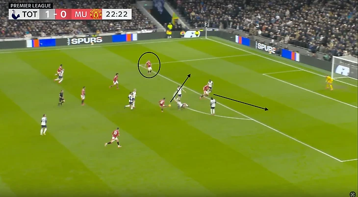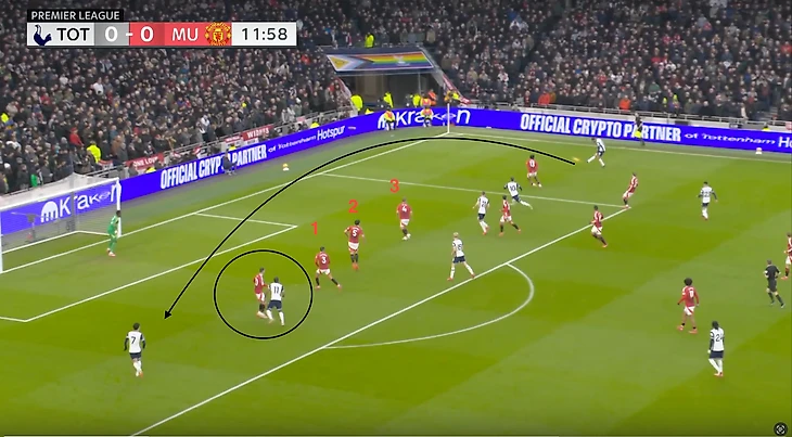 На втором скрине видно, что Мазрауи с Далотом верно разобрали игроков, но португалец все равно не успел накрыть Сона. Магуайр и Де Лигт опустились ниже и а) охраняют пустое пространство; б) не контролируют Бергвала (отмечен кружком). Каземиро по прежнему не успевает к эпизоду.