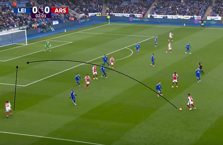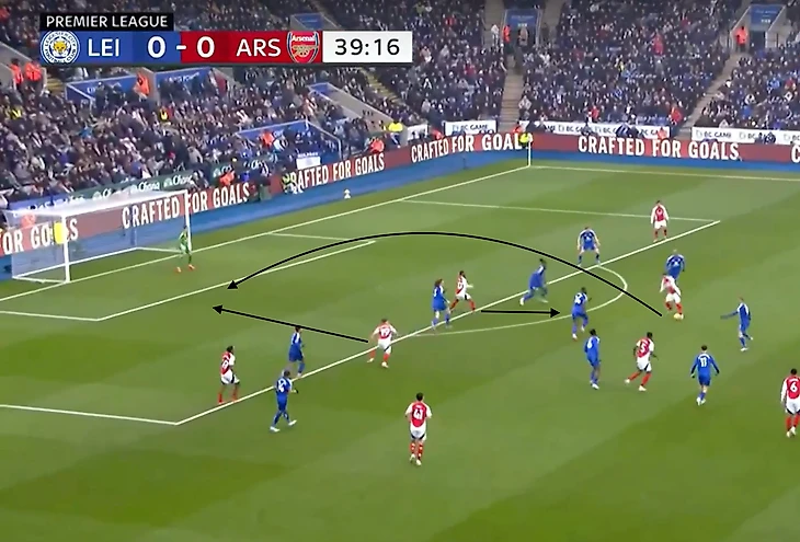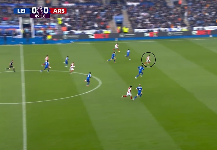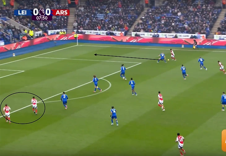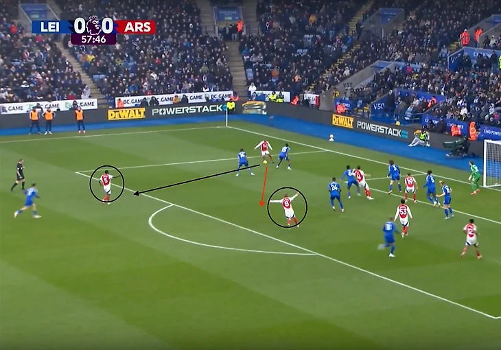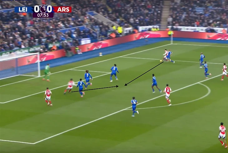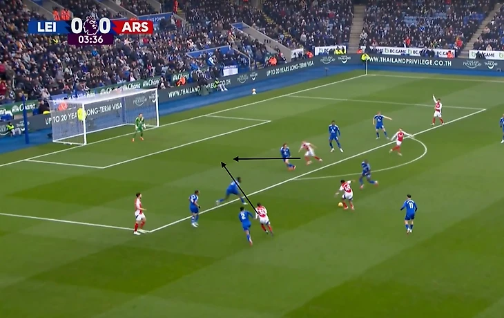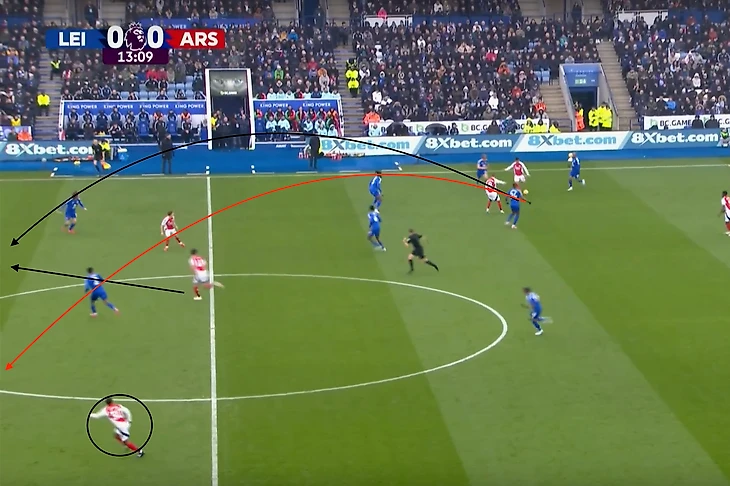в первом тайме особенно сильно бросалось в глаза, что штрафная «Лестера» должным образом не заполнялась игроками «Арсенала». Полузащитники не всегда обеспечивали атакам второй темп. Да, были подключения Райса исключительно на верховые подачи, но это все равно создавало скученность игроков в штрафной, что является плохим сценарием для такого игрока как Стерлинг. Мы же знаем, что ему необходимо пространство.