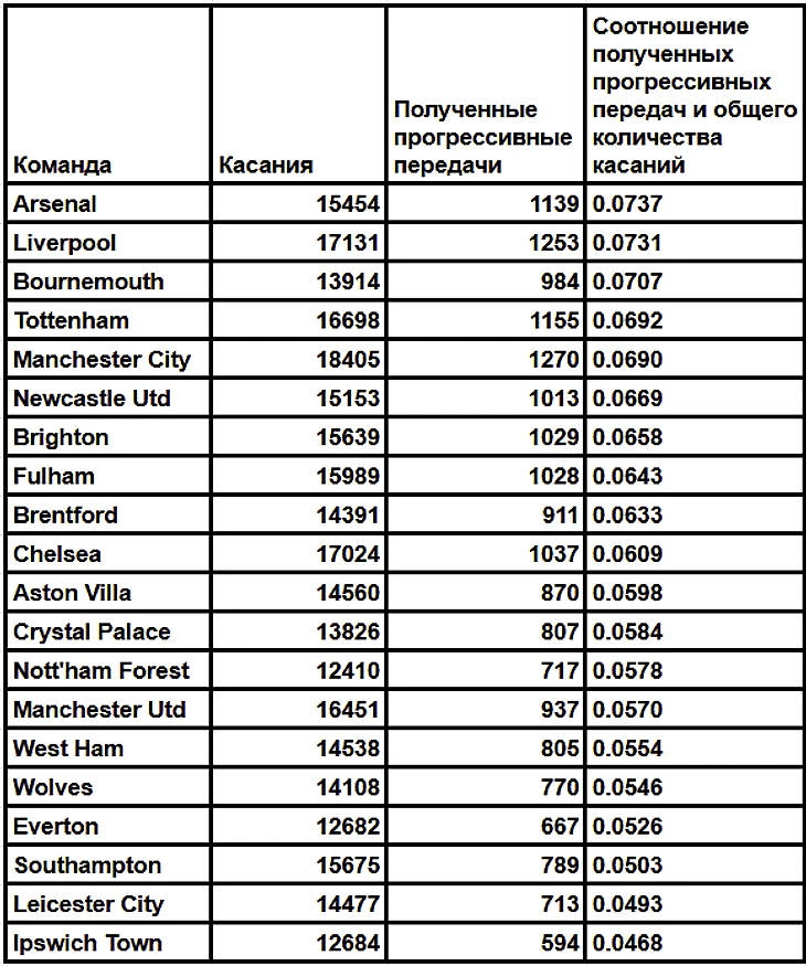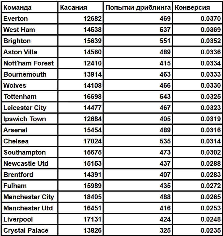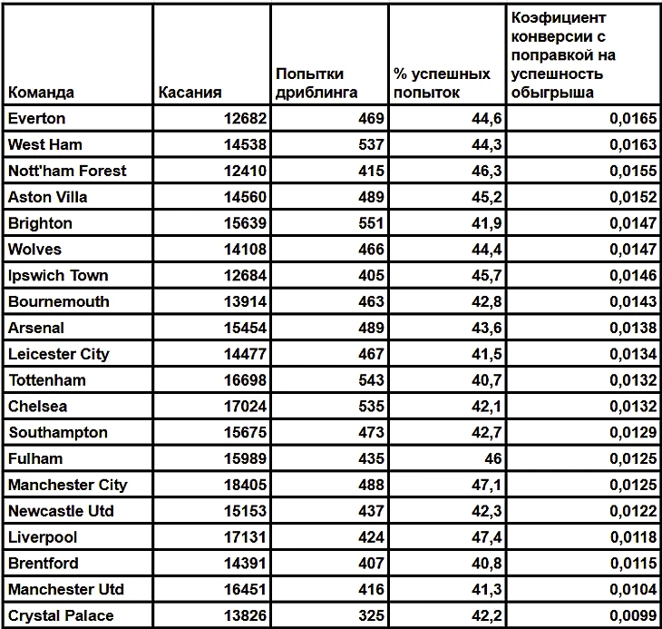 Интересно, как в целом эта таблица не коррелирует с турнирной, а скорее даже наоборот. Из топов тут только «Сити». Можно ли делать вывод что чем выше команда, тем меньше игроки будут пытаться тащить мяч своими силами? Хочется, но пахнет ложной корреляцией.