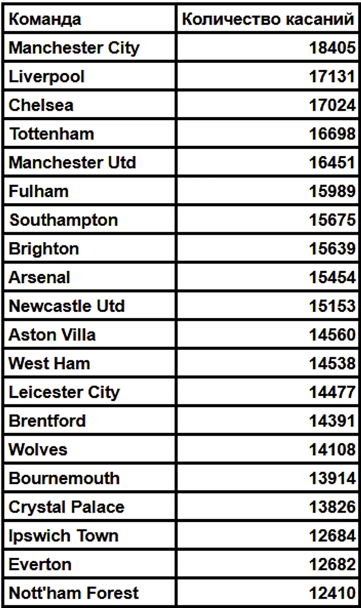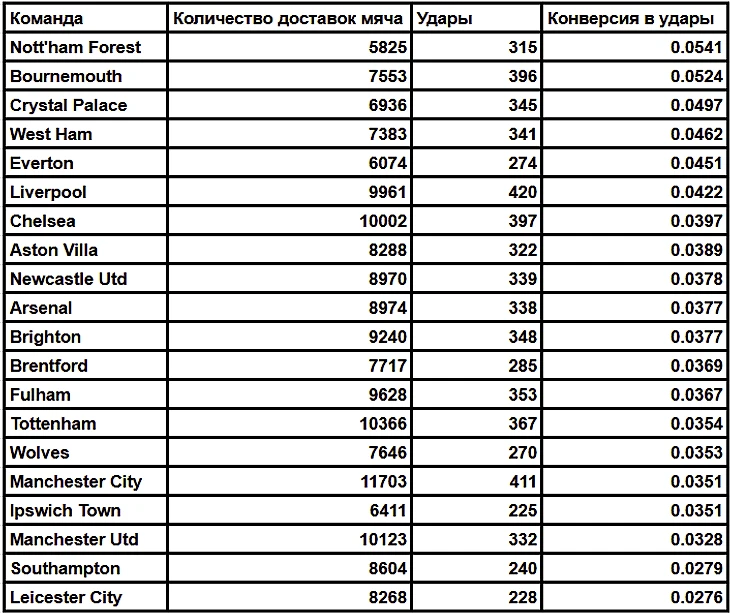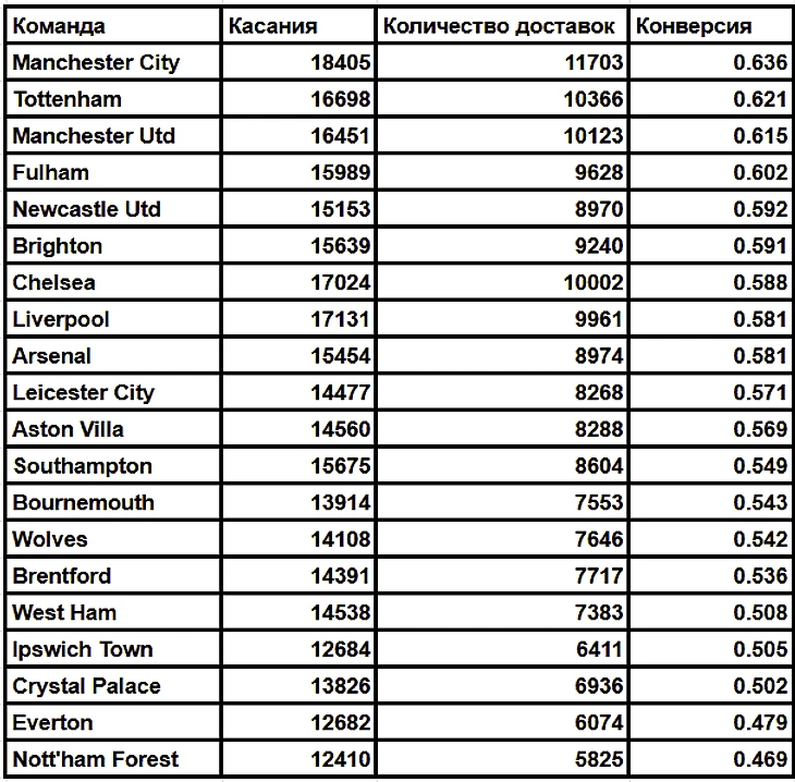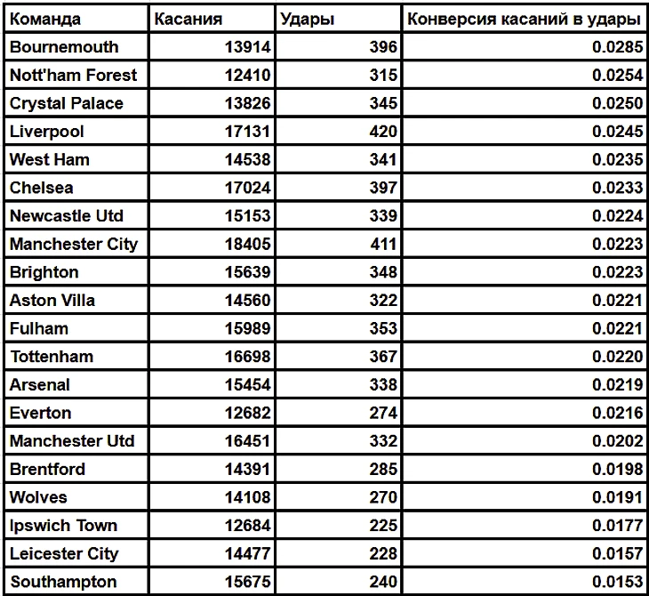 Вот эта таблица ожидаемо коррелирует с таблицей конверсии касаний в удары. «Арсенал», конечно жестко хакает систему.