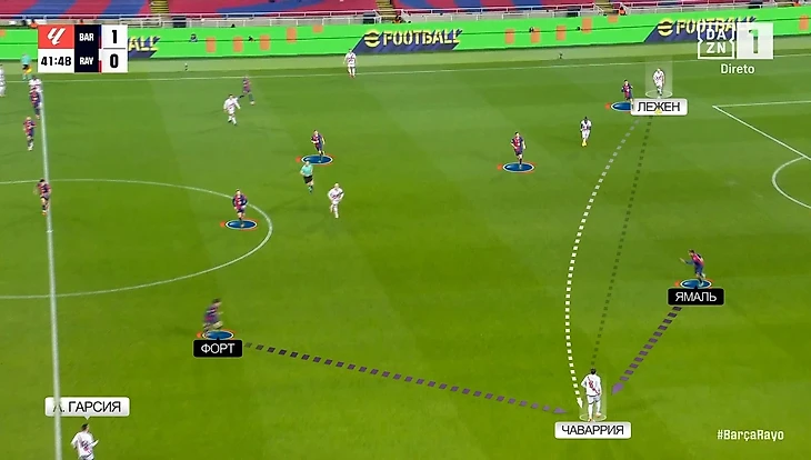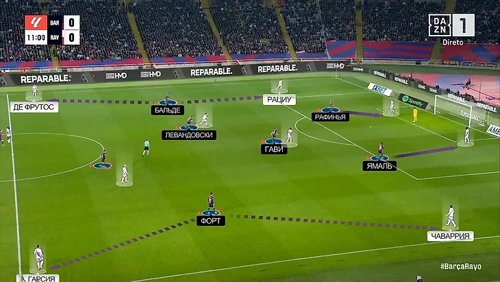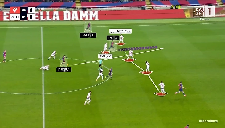 Несмотря на то, что фланг Андрея Рациу у «Райо» в целом более атакующий, именно против «Барселоны» команда Иньиго Переса большую часть своей угрозы создала с противоположного края. На это повлиял и сюрприз в составе «Барсы» (Форт вместо Кунде), и его партнер – Ламин Ямаль, который, конечно, отрабатывает в обороне, но не на таком высоком уровне, как Рафинья с противоположного фланга.