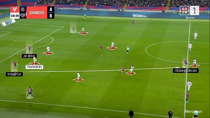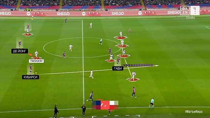 Но «Барса» довольно быстро смекнула, как можно обратить себе на пользу такую модель давления, и роль Иси Палазона в частности. Френки де Йонг стал опускаться к ЦЗ – таким образом Иси уже не мог одновременно давить на Кубарси и закрывать Френки. Пау получил свободу: