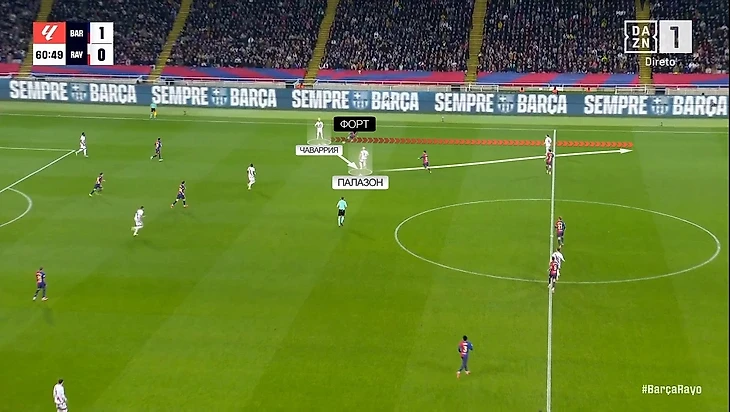 И именно фланговые зоны «Райо» активно проверял. Особенно привлекательной мишенью выглядел Эктор Форт – из-за малого количества игрового времени в этом сезоне он не так своевременно переключался между игроками, как, например, Жюль Кунде. Именно так произошло в начале атаки, которая привела к отмененному голу «Райо». Лежен переводит на противоположный фланг, где получил свободу Чаваррия: