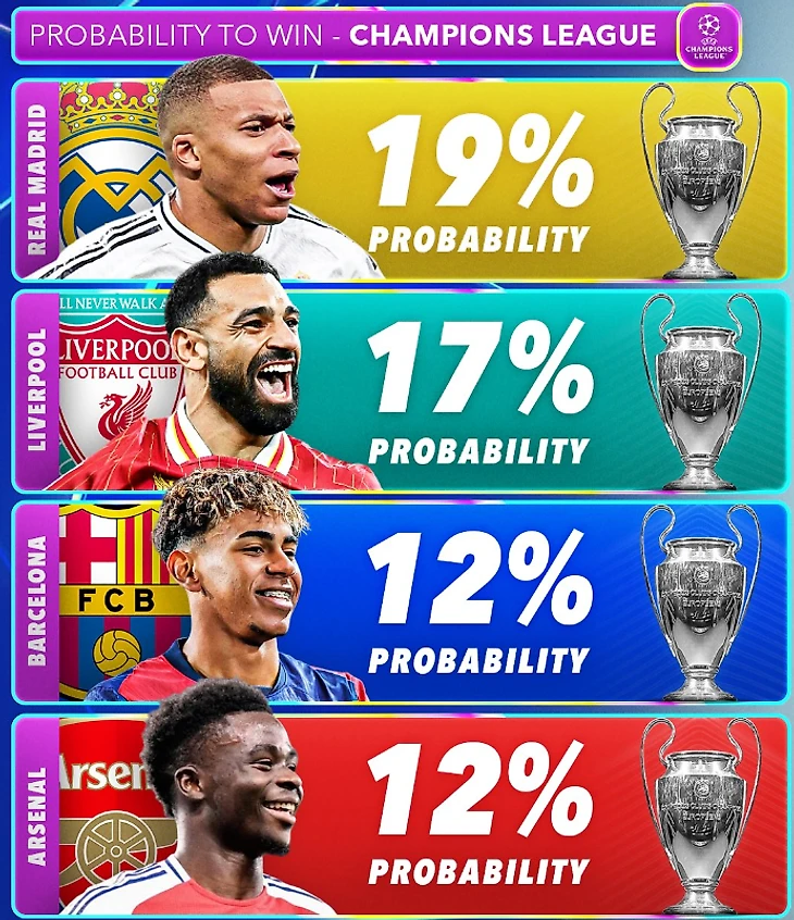 Несмотря на выдающуюся форму «Ливерпуля», мадридцам дают 19% вероятности триумфа – это самый высокий показатель. У команды Арне Слота – всего на два процента меньше.