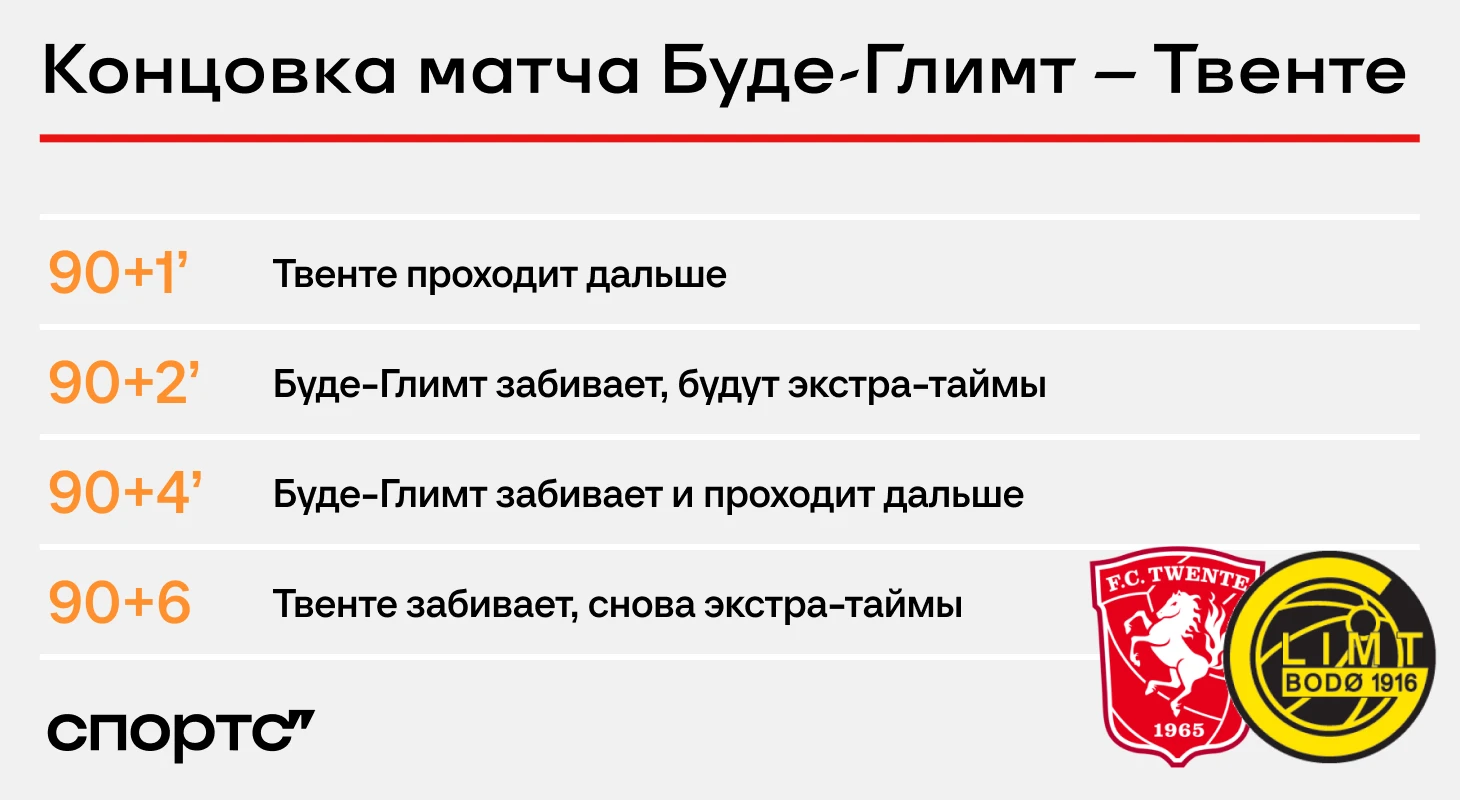 ● «Буде-Глимт» все-таки прошел «Твенте» – с безумной концовкой и тремя автоголами (5:2). Три мяча после 90-й минуты, «Буде» повел 3:1, но на 90+6 допустил экстра-таймы: Никита Хайкин даже спас в упор, но мяч предательски отскочил в угол.