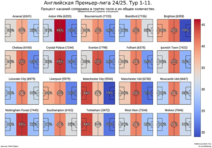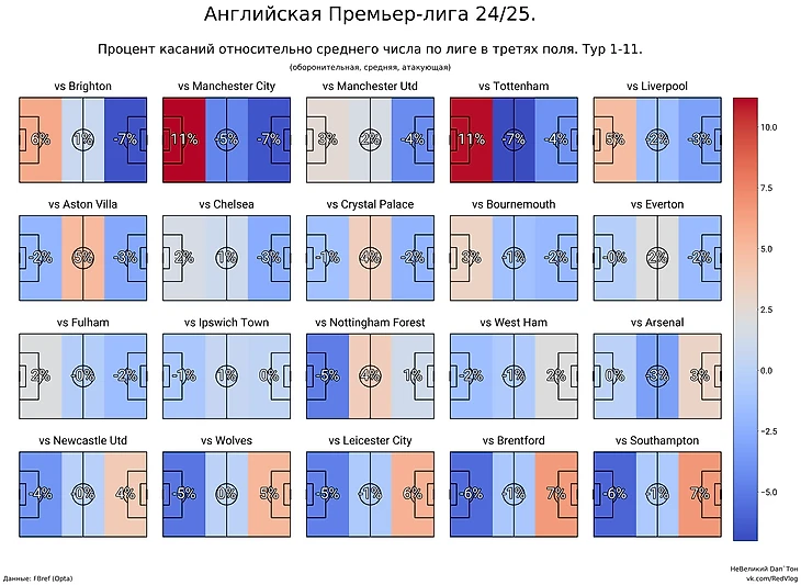 Карта касаний в АПЛ по третям поля.