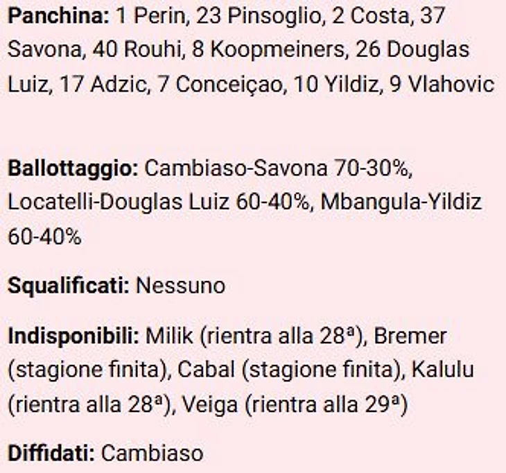 С обороной у Юве из-за травм творится страшное. Вчерашний лавочник Ньюкасла Келли, пока не показавший практически ничего, внушающего оптимизм, играл за туринцев в плей-офф ЛЧ! Вот до чего дошло. И он снова окажется на поле в предстоящей игре Серии А. Тогда как Калулу и Вейга, прекрасно влившиеся в состав, пропустят еще пару-тройку игр из-за травм. Про Бремера и Кабаля даже вспоминать не хочется. Злой рок, не иначе.