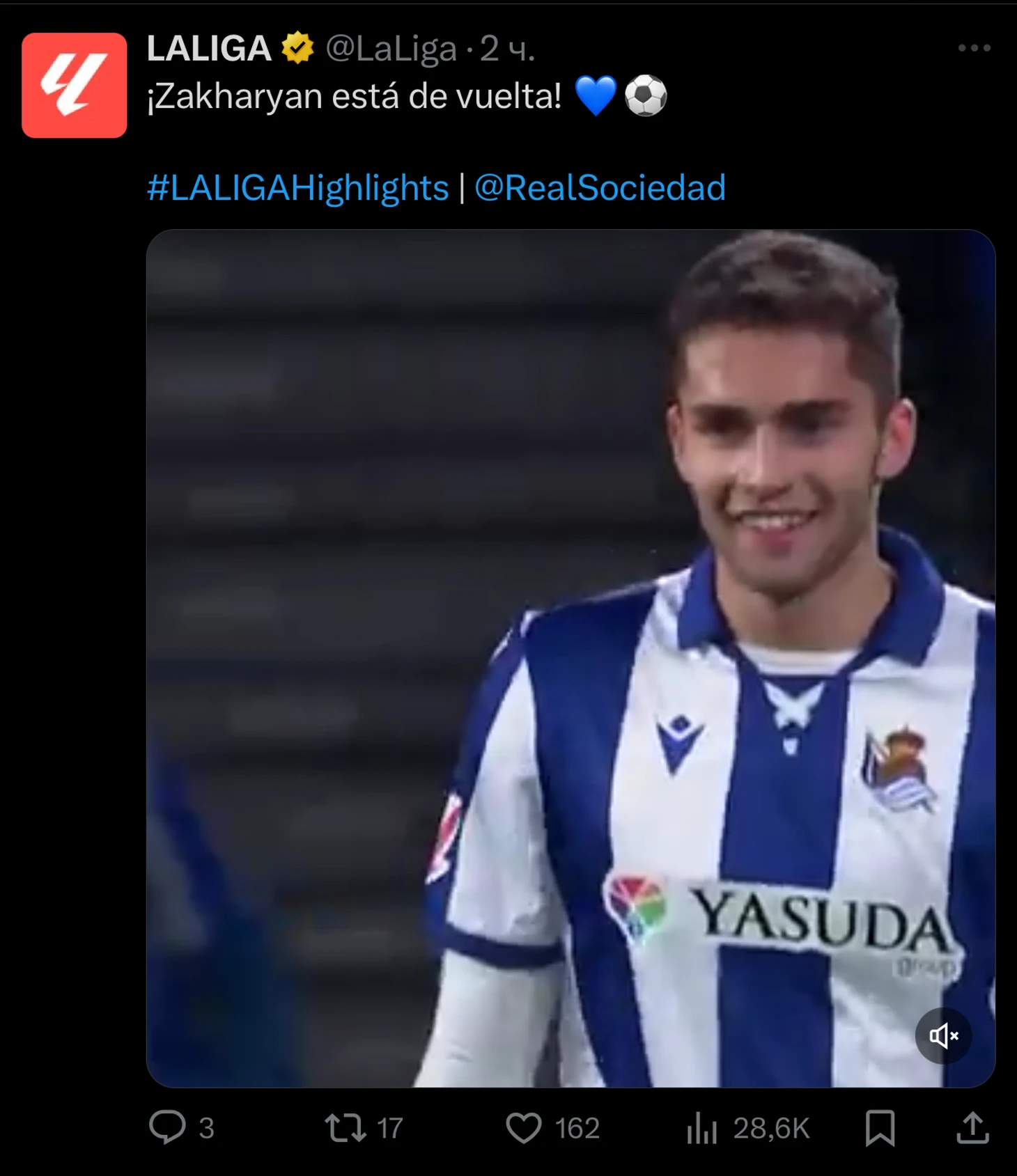Яркий камбэк отдельно отметил даже официальный аккаут Ла Лиги, сообщив всему футбольному твиттеру (староверы на месте), что «Захарян вернулся!»