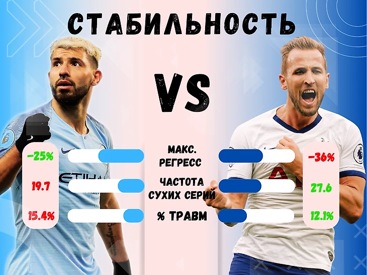 Первый параметр – это максимальный регресс статистики Г+А между сезонами в %. Например, у Агуэро это сезоны 14/15 и 15/16: