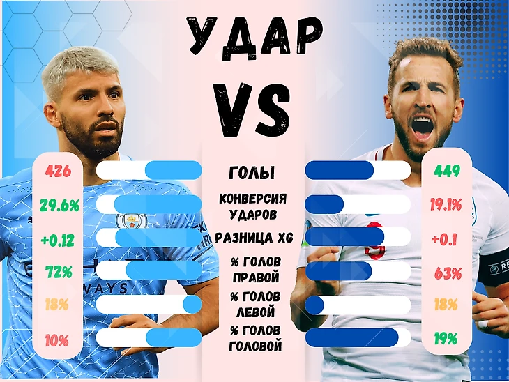 Если брать в общем, удар у Харри мощнее, а Агуэро более точен. Англичанин владеет очень хлестким ударом, причем с обеих ног, чем часто пользуется. Он не стесняется бить с менее очевидных позиций и не редко забивает. Его крученный удар перед штрафной, я вообще считаю его визитной карточка. К тому же, Кейн активно пользуется своими габаритами, забив 19% от всех голов именно на втором этаже.