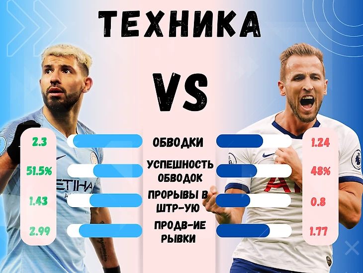 Дриблинг был одним из основных орудий Агуэро в атаке. Благодаря своему низкому центру тяжести, он мог спокойно разбираться с защитниками в штрафной на своем мелком дриблинге. Также аргентинец мог опускаться ниже и с глубины протаскивать мяч, попутно обходя соперников. Кейн же игрок другого плана. Находясь с мячом в ногах, он скорее распоряжается с ним по-другому, часто находя соперников передачами или пробивая по воротам. Об этом говорит и статистика: ни в одном из параметров своего визави он превзойти не смог.