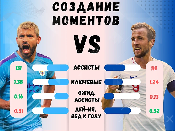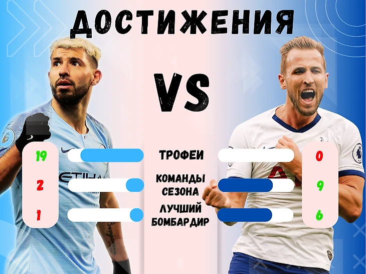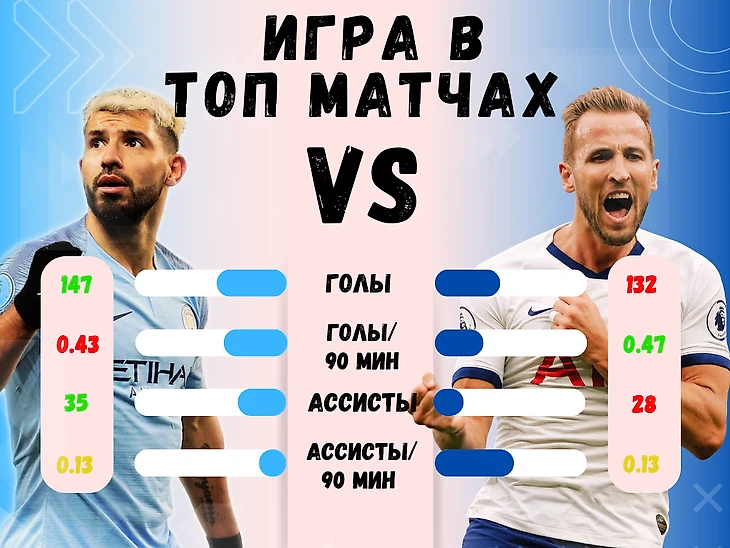 Оба футболиста неплохо проявляют себя в важных матчах, имея неплохую статистику. Агуэро оформил чуть больше и голов, и ассистов, но при этом и провел больше матчей. По голам на 90 минут, например, лидирует Кейн.