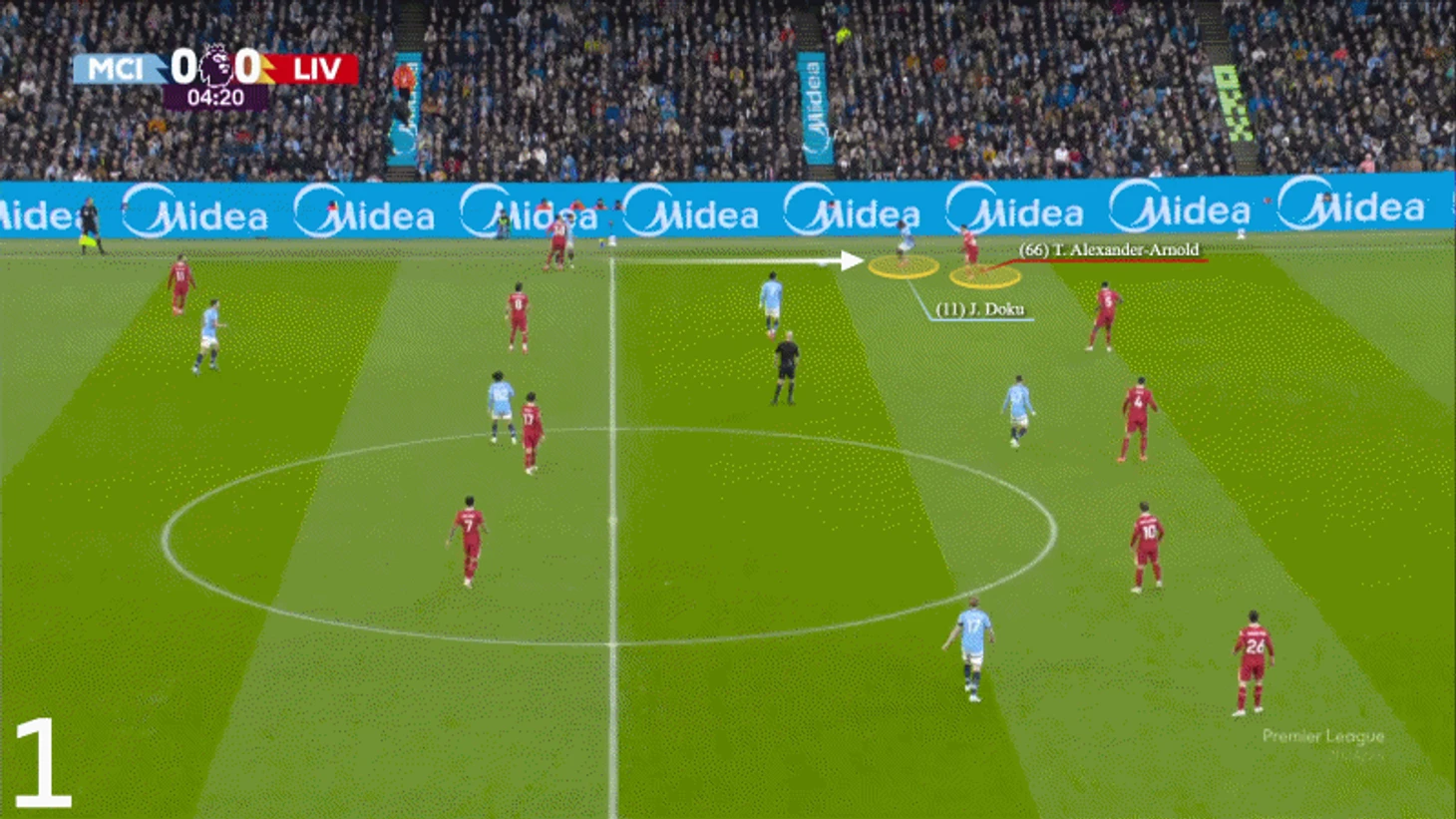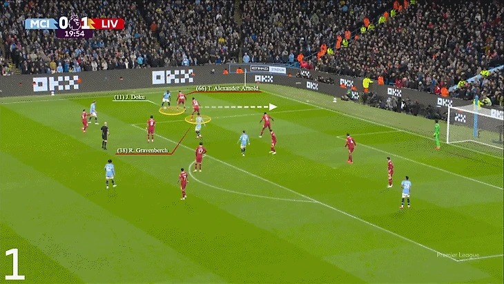В начале игры Александер-Арнолд остался один на один с Доку, и его партнеры по команде ему практически не помогали. На 16-й минуте Доку, разогнавшись, снова обошел защитника. Райан Гравенберх был ближе, но не смог оказать поддержку.
