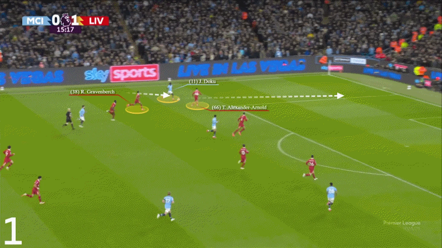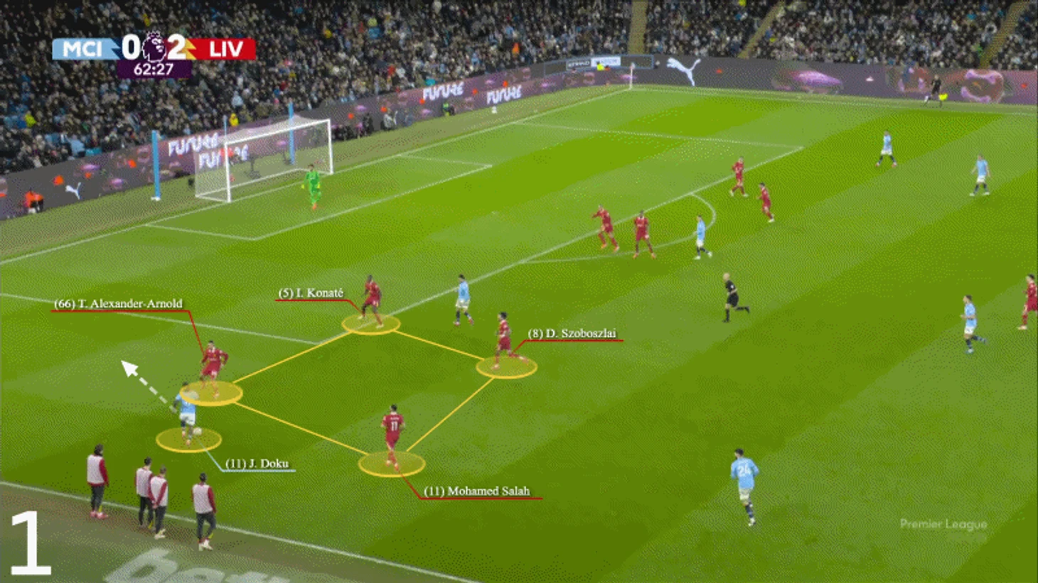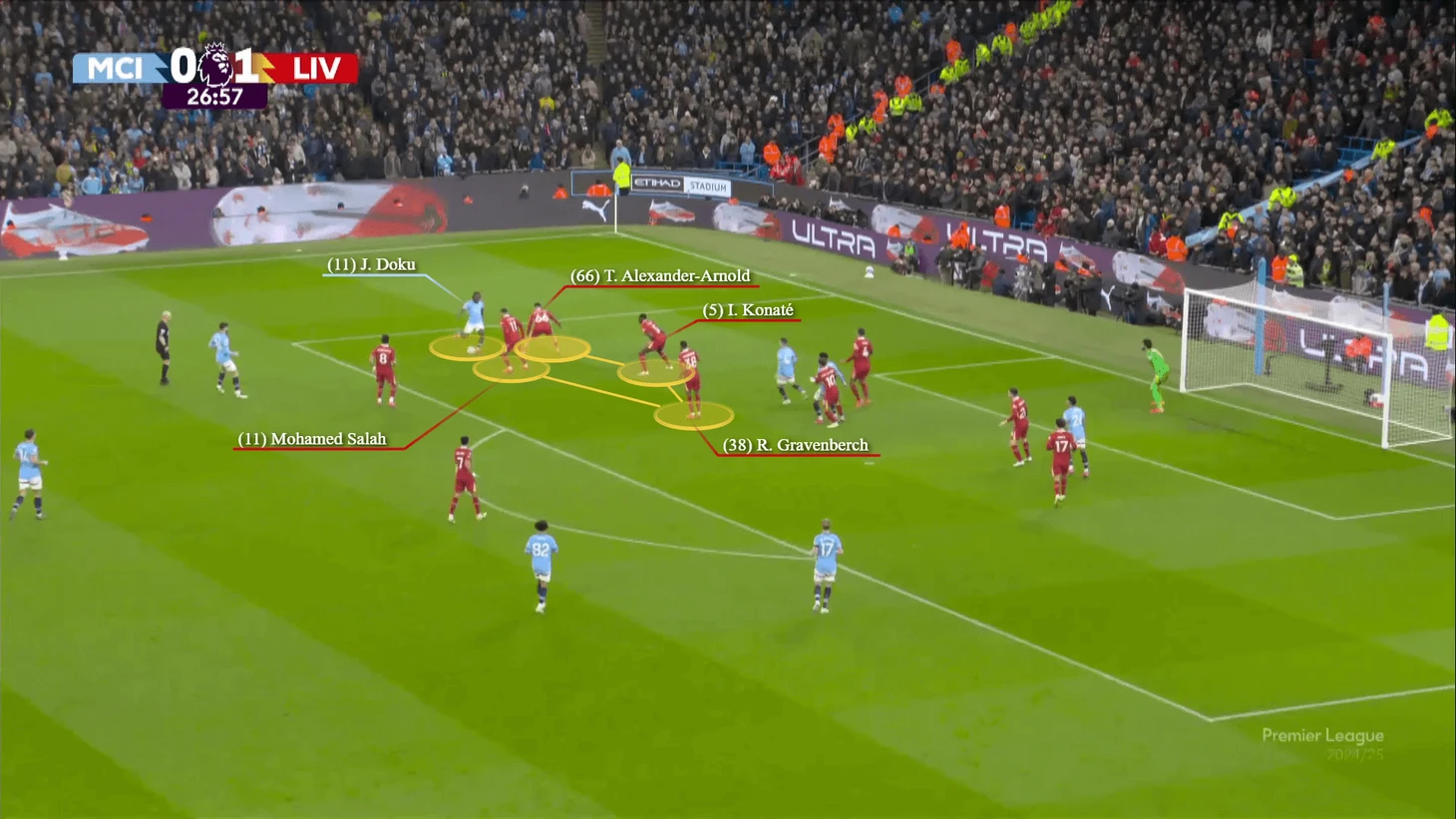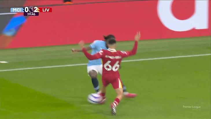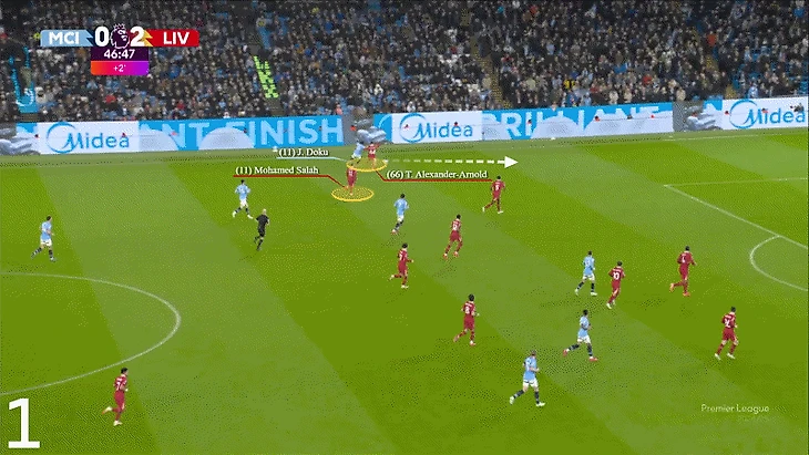 В первом случае Александер-Арнолд попытался остановить контратаку у ее источника, и, пока он приходил в себя, Доку его снова опередил. Оба инцидента произошли на половине поля «Манчестер Сити», поэтому у «Ливерпуля» были свои шансы остановить контратаку.
