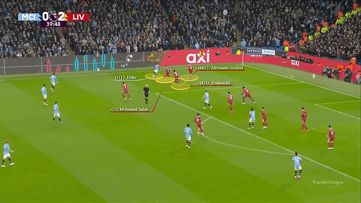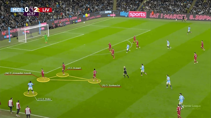 Это стало темой всей оставшейся игры. Редко когда Доку оказывался один на один с Александер-Арнолдом без того, чтобы кавалерия не прибывала через мгновение после того, как он прошел с мячом дальше. Это была коллективная работа с участием Конате, Гравенберха, Собослаи и Салаха.