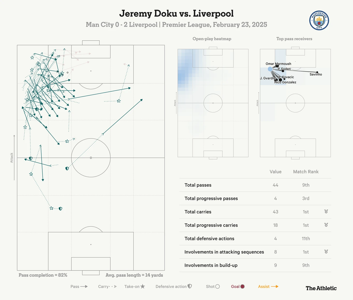 По данным FBref, вингер реализовал 15 из 21 попыток обыгрышей, большинство из которых пришлось на крайнего защитника, но конечного продукта от Доку и его товарищей по команде не последовало. Влияние Доку отражено ниже на панели игроков.