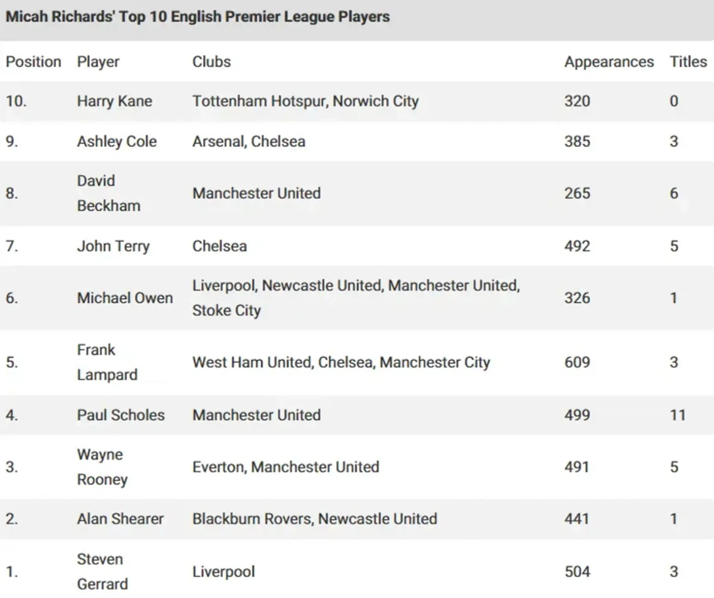 Возглавил список Стивен Джеррард, которого Ричардс назвал величайшим игроком АПЛ за всю историю. В списке Ширера Стивен был третьим.
