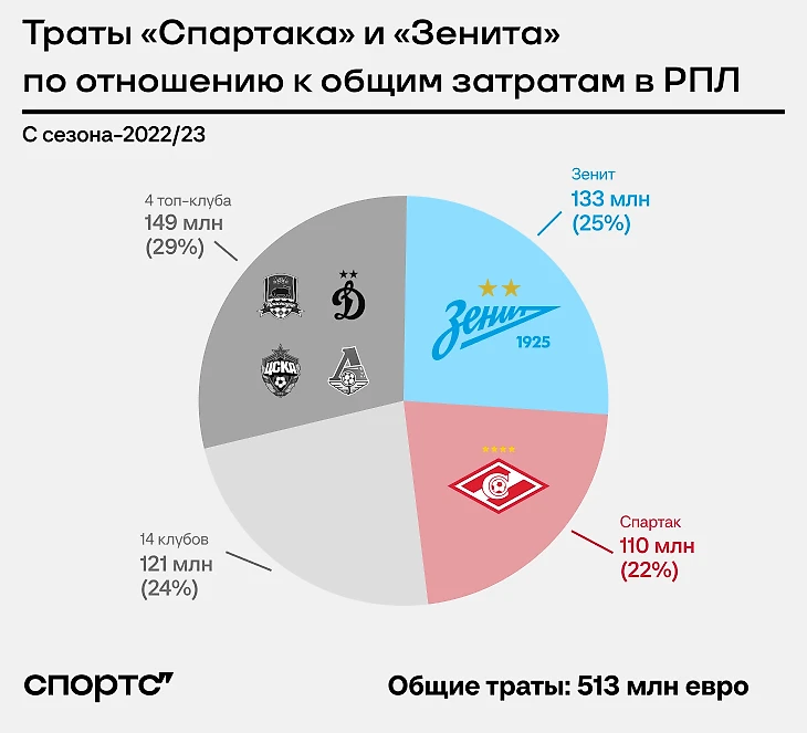 Если возьмем только сезон-2024/25, у «Спартака» и «Зенита» аж 63% затрат всей лиги! 133 миллиона евро они, 79 млн – остальные 14 клубов РПЛ вместе.