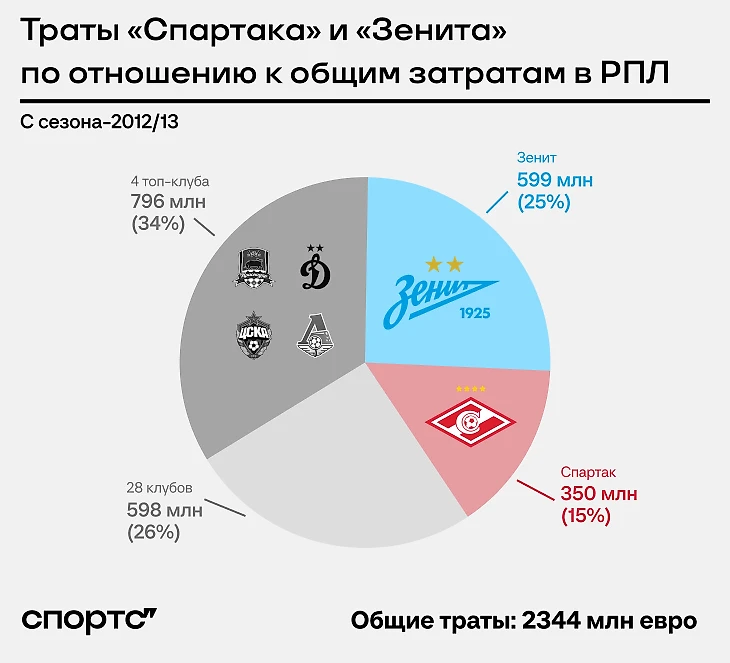 Очень внушительно: вдвоем у «Спартака» и «Зенита» трат почти на миллиард евро, это 40% от всех покупок 34 клубов РПЛ, сыгравших в РПЛ за это время.
